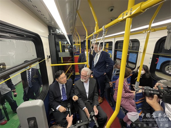 工厂参观结束后,市长Rex Parris陪同大使乘坐比亚迪纯电动大巴。过程中,大使对纯电动大巴的静谧性和平顺性印象深刻,市长也为大使详尽介绍了比亚迪如何改善当地社区居民出行方式。