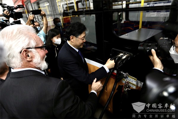 秦刚大使乘坐比亚迪纯电动大巴