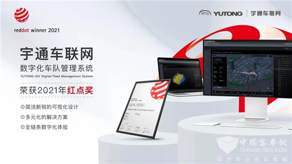 值得一提的是,2021年,宇通车联网车队管理系统荣获“2021年红点品牌与传达设计大奖”,成为国内首家客车数字化解决方案获此殊荣的公司。