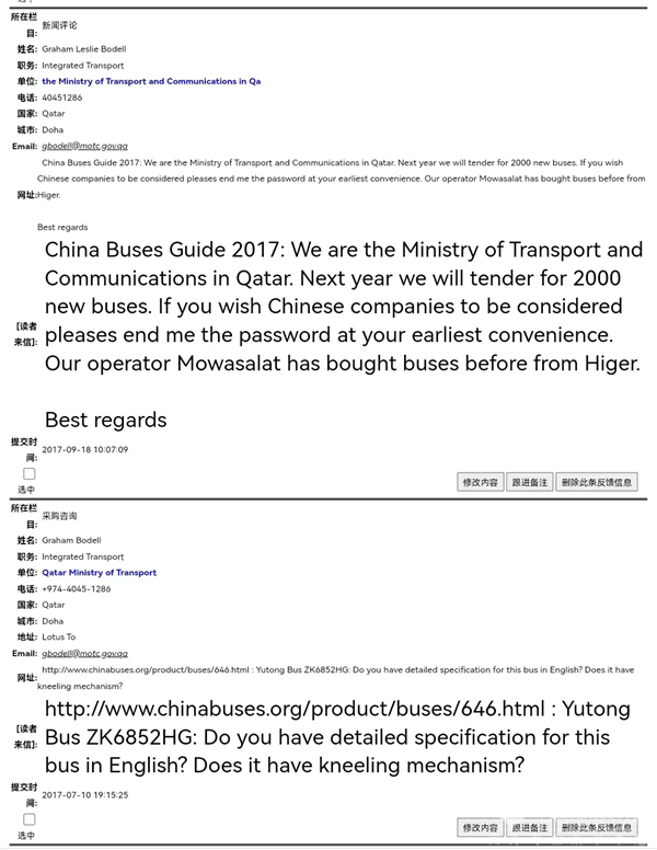 客车英文网收到卡塔尔交通部政府邮箱询问函