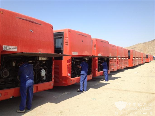 众所周知,沙特大量的国土面积都被广袤的沙漠覆盖,面对这片土地的“热情”,金龙客车不仅以卓越品质,经受住了沙特高温路况的考验。在每年圣城麦加的朝觐活动中,金龙客车与沙特客户紧密联系,共同做好“特殊时期”的海外售后服务工作,保障了各家运输公司在朝觐期间的运营,为沙特朝觐运输工作交出了一份完美的“金龙答卷”。每年,沙特朝觐部都会公布年度麦加朝觐运输服务公司的综合评价名次,由金龙客车提供产品和售后服务的运输公司,基本每年包揽了该表彰名单的前五名。