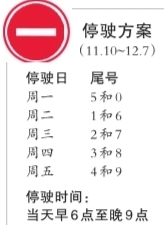 根据《北京市人民政府关于实施交通管理措施的通告》,自11月10日起至12月7日止,每星期一至星期五分别停驶车牌尾号为5和0、1和6、2和7、3和8、4和9(含临时号牌;机动车牌尾号为英文字母的按0号管理)的机动车。