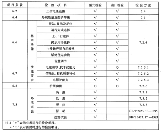 8.1 报站器检验分型式检验和出厂检验。型式检验和出厂检验项目见表1。