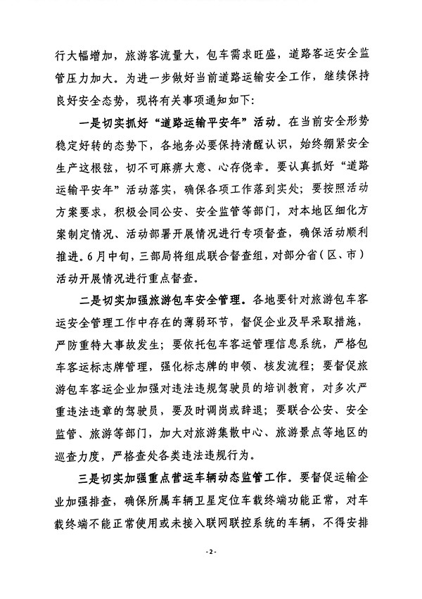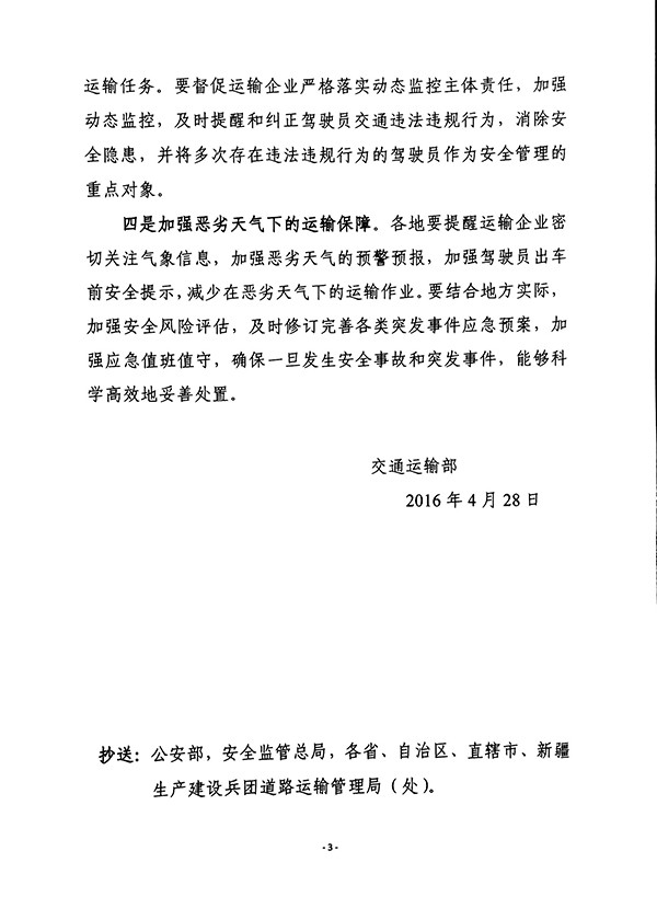 2016年4月28日,交通运输部发布《交通运输部关于进一步加强当前道路运输安全管理工作的通知》,强调为进一步做好当前道路运输安全工作,要切实抓好“道路运输平安年”活动、加强旅游包车安全管理、加强重点营运车辆动态监管工作、加强恶劣天气下的运输保障工作。通知全文如下: