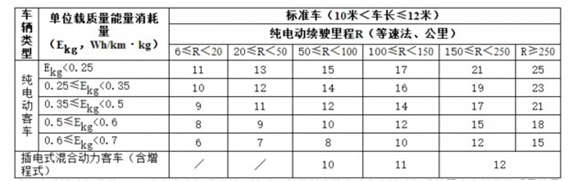 注:上述补助标准以10-12米客车为标准车给予补助,其他长度纯电动客车补助标准按照上表单位载质量能量消耗量和纯电动续驶里程划分,插电式混合动力客车(含增程式)补助标准按照上表纯电动续驶里程划分。其中, 6米及以下客车按照标准车0.2倍给予补助;6米<车长≤8米客车按照标准车0.5倍给予补助;8米<车长≤10米客车按照标准车0.8倍给予补助;12米以上、双层客车按照标准车1.2倍给予补助。