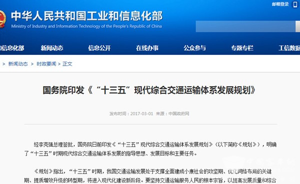 经李克强总理签批,国务院日前印发《“十三五”现代综合交通运输体系发展规划》(以下简称《规划》),明确了“十三五”时期现代综合交通运输体系发展的指导思想、发展目标和主要任务。2017年
