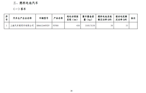 唯一上榜的燃料电池客车是上海汽车商用车有限公司生产的产品名称FCV80,车型型号为SH6612A4FCEV,续航里程为430公里。