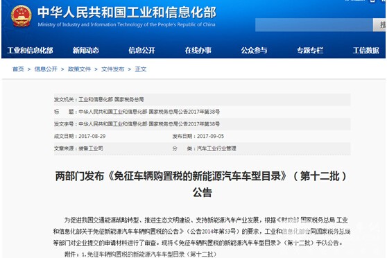 为促进我国交通能源战略转型、推进生态文明建设、支持新能源汽车产业发展,根据《财政部 国家税务总局 工业和信息化部关于免征新能源汽车车辆购置税的公告》(公告2014年第53号)的要求,工业和信息化部会同国家税务总局等部门对企业提交的申请材料进行了审查。现将《免征车辆购置税的新能源汽车车型目录》(第十二批)予以公告。