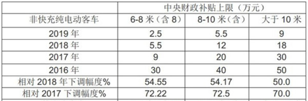 从2019年的补贴方案看,新能源补贴额度下调幅度相对2018年的补贴标准在55.55-49.33%不等。2019年不同种类的新能源客车补贴调整具体幅度见下表: