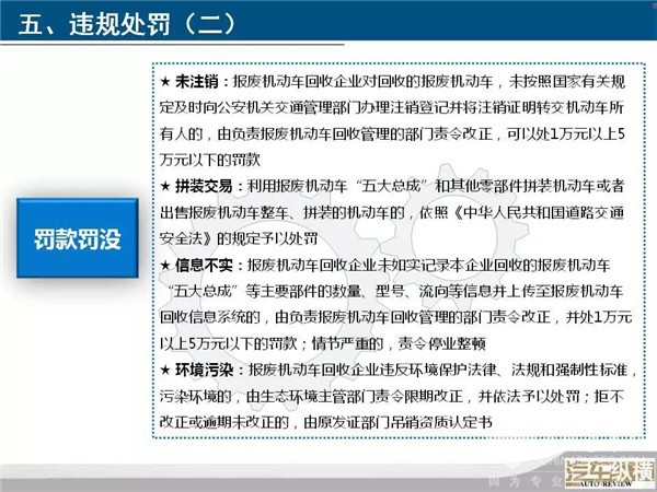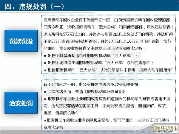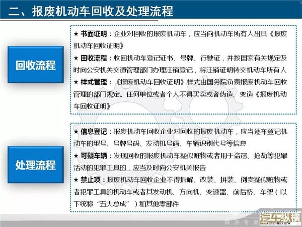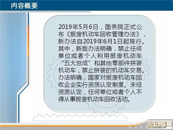 2019年5月6日,国务院正式公布《报废机动车回收管理办法》,新办法自2019年6月1日起施行。其中,新版办法明确,禁止任何单位或者个人利用报废机动车“五大总成”和其他零部件拼装机动车,禁止拼装的机动车交易。办法明确,国家对报废机动车回收企业实行资质认定制度。未经资质认定,任何单位或者个人不得从事报废机动车回收活动。