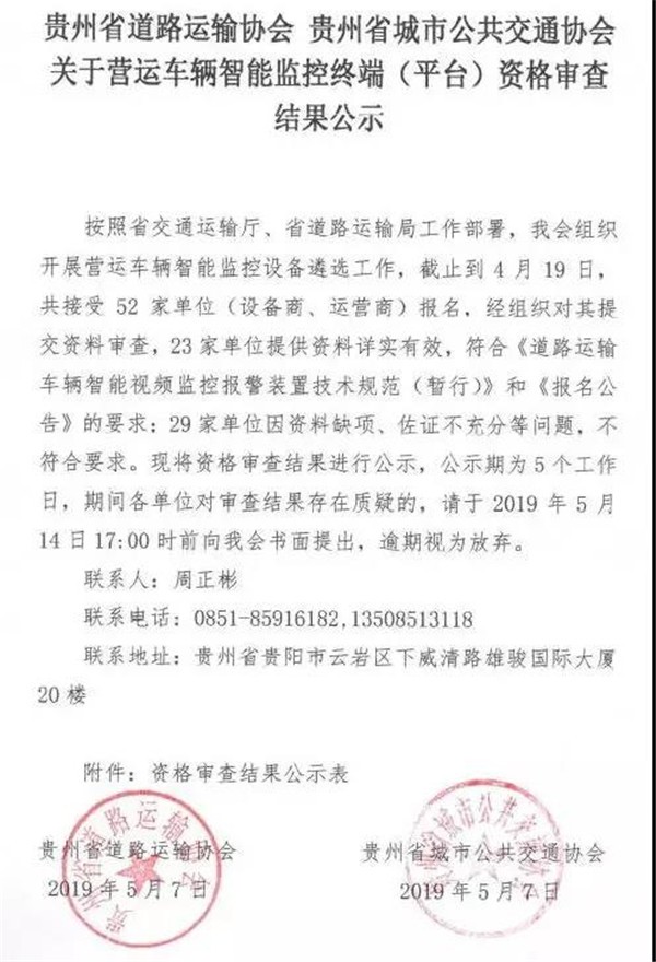 IOV114获悉,2019年5月7日,贵州省道路运输协会、贵州省城市公共交通协会公布了贵州省关于营运车辆智能监控终端(平台)资格审查结果公示。公示表示,截止到4月19日,一共52家单位(设备商、运营商)报名接受审查,23家单位提供资料详实有效,符合《道路运输车辆智能视频监控报警装置技术规范(暂行)》和《报名公告》的要求。29家单位因资料缺项、佐证不充分等问题,不符合要求。