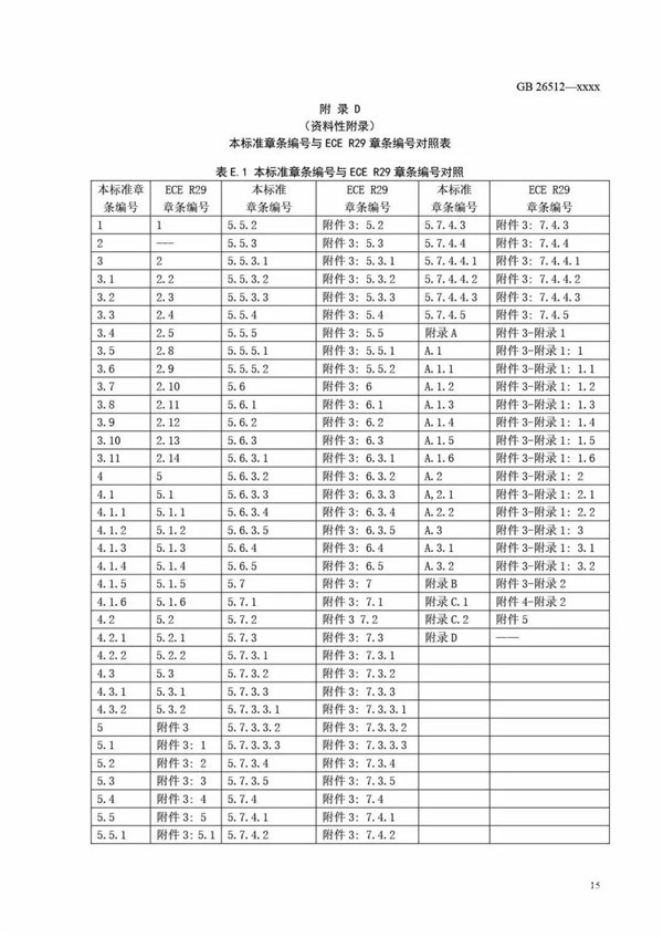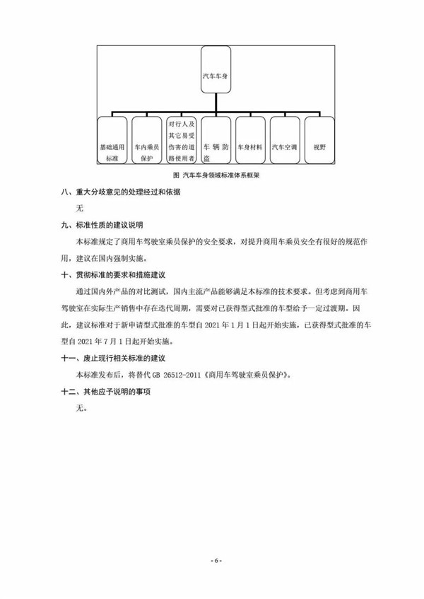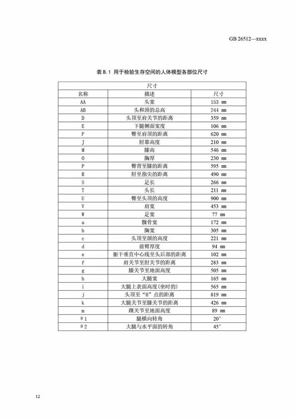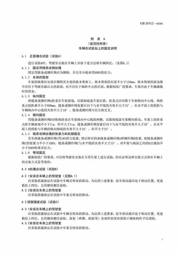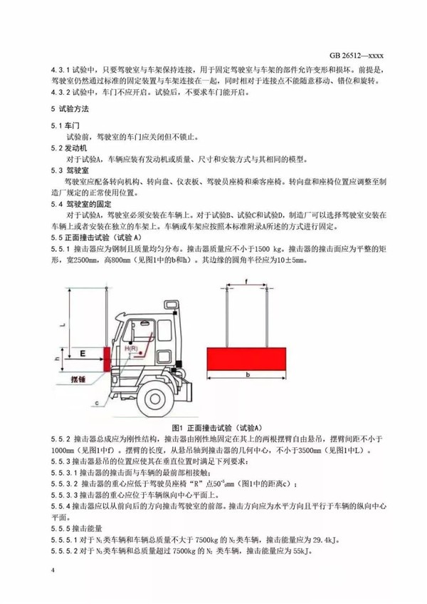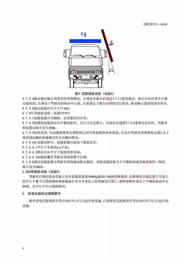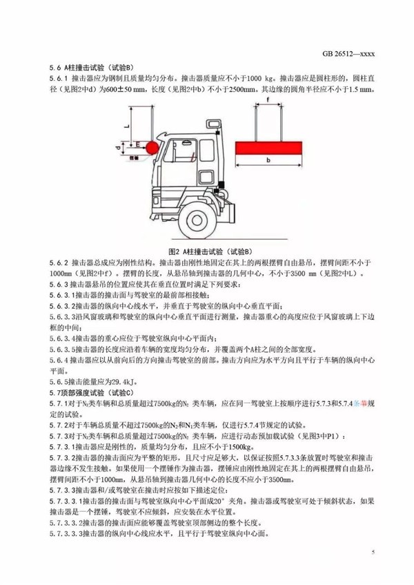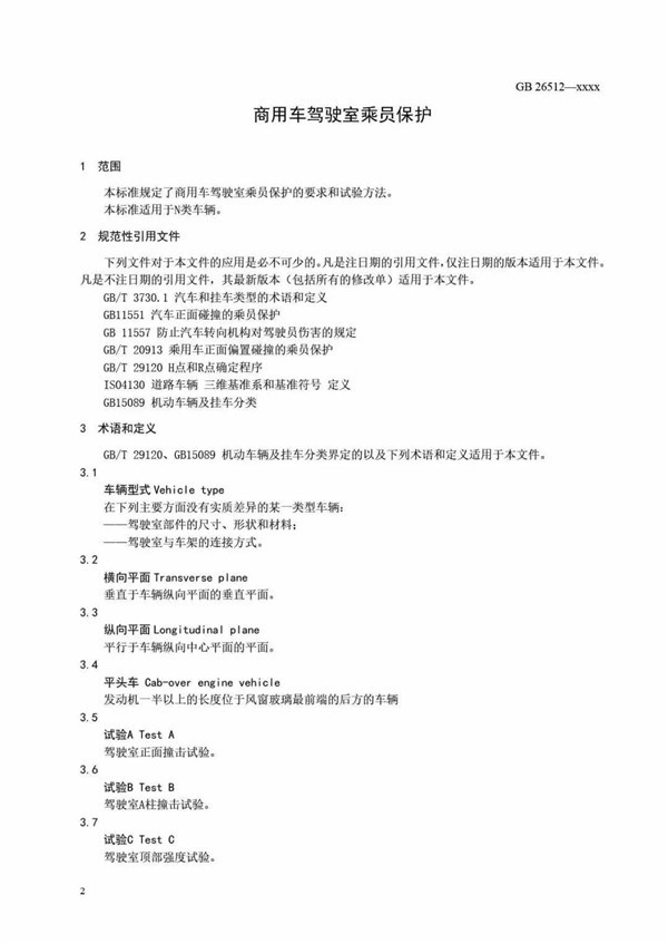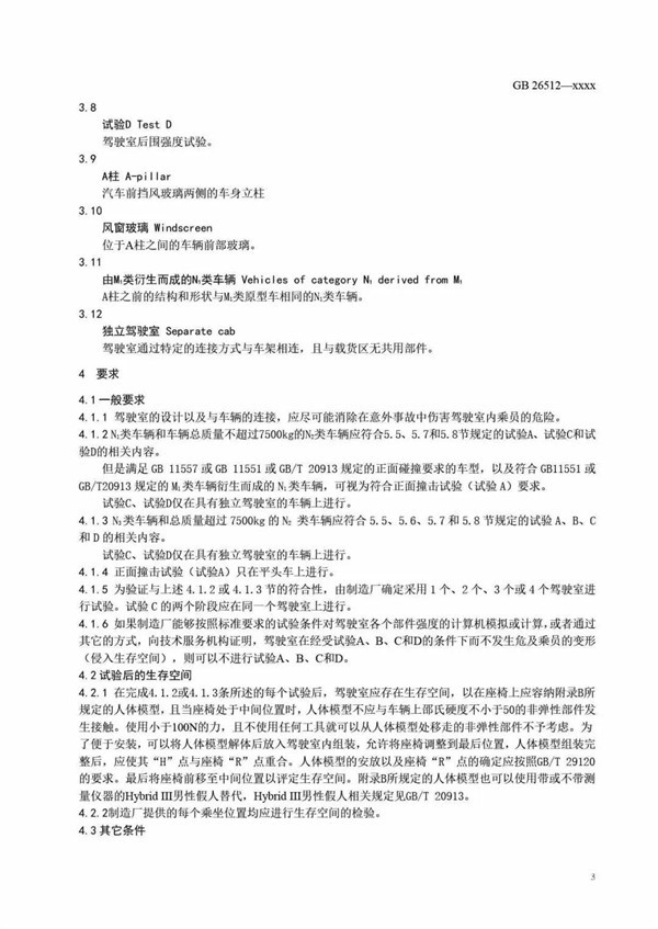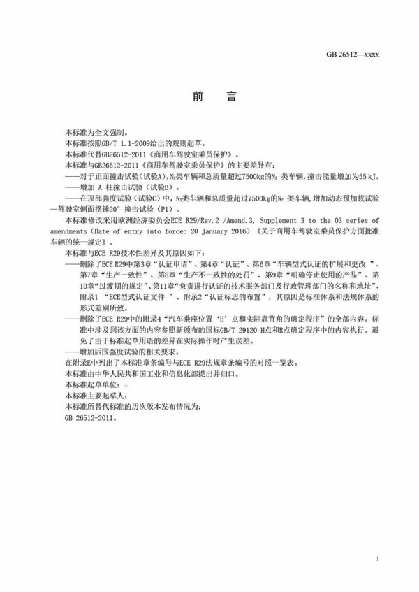 本标准为全文强制,按照GB/T 1.1-2009给出的规则起草。本标准代替GB26512-2011《商用车驾驶室乘员保护》,与GB26512-2011《商用车驾驶室乘员保护》的主要差异有:对于正面撞击试验(试验A),N3类车辆和总质量超过7500kg的N2 类车辆,撞击能量增加为55 kJ;增加 A 柱撞击试验(试验B);在顶部强度试验(试验C)中,N3类车辆和总质量超过7500kg的N2类车辆,增加动态预加载试验—驾驶室侧面摆锤20°撞击试验(P1)。