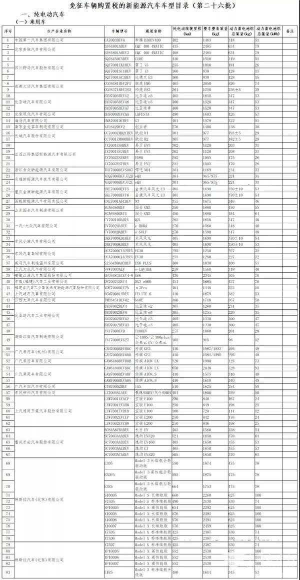 附件: 1.免征车辆购置税的新能源汽车车型目录(第二十六批)