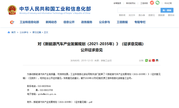 为推动新能源汽车产业高质量、可持续发展,2019年12月3日,工业和信息化部会同有关部门起草了《新能源汽车产业发展规划(2021-2035年)》(征求意见稿),并向社会公开征求意见。
