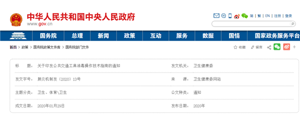 2020年1月29日,国务院应对新型冠状病毒感染的肺炎疫情联防联控机制印发《关于印发公共交通工具消毒操作技术指南的通知》,指导汽车、火车、飞机、轮船等公共交通工具做好消毒工作,防止新型冠状病毒感染的肺炎通过交通工具传播和扩散,全文如下: