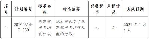 2020年3月9日,工信部发布《汽车驾驶自动化分级》推荐性国家标准报批公示,在标准批准发布之前,为进一步听取社会各界意见,现对标准报批稿及编制说明予以公示,截止日期2020年4月9日。此外,公示内容显示,此标准将于2021年1月1日正式实施。