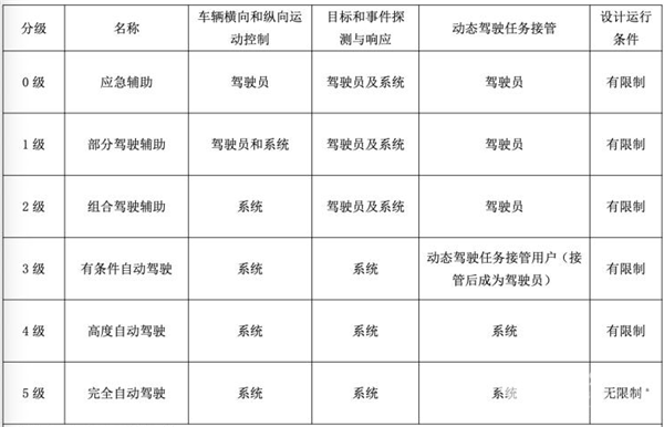 该标准将自动驾驶划分为0-5等级: