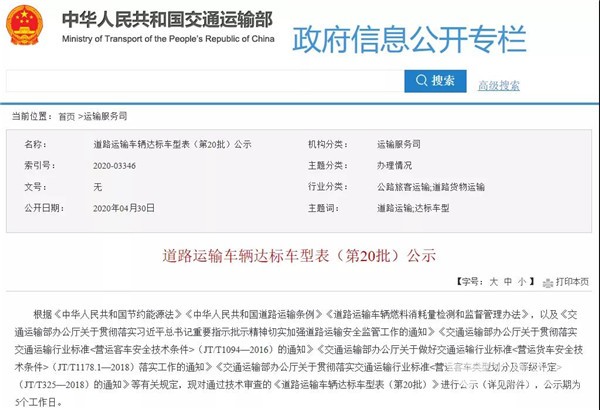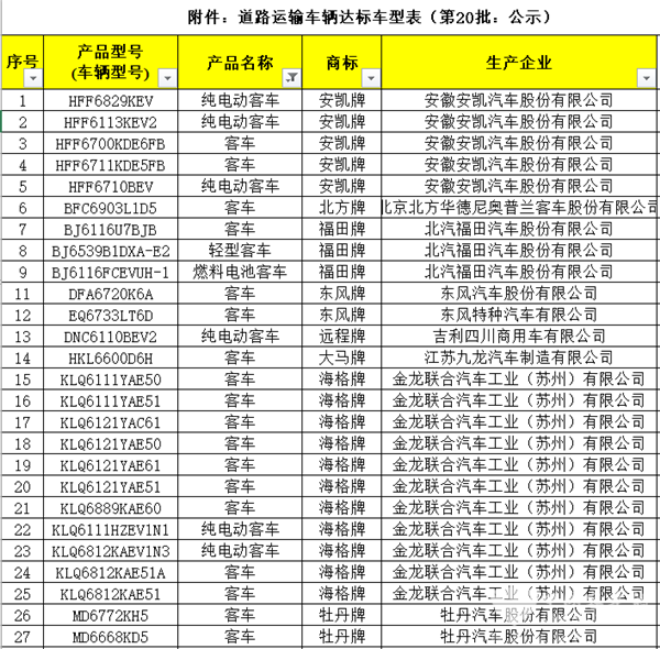 2020年4月30日,交通运输部公示了道路运输车辆达标车型表(第20批),本批达标车型共包括客车139款,其中包括121款传统客车、16款纯电动客车、1款轻型客车和1款燃料电池客车。