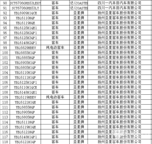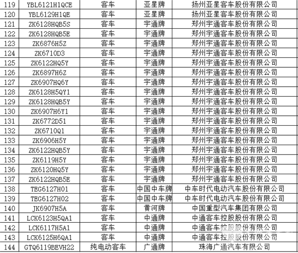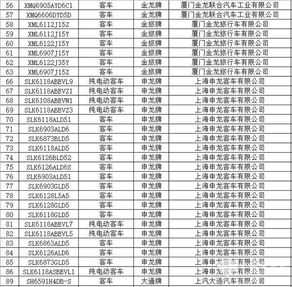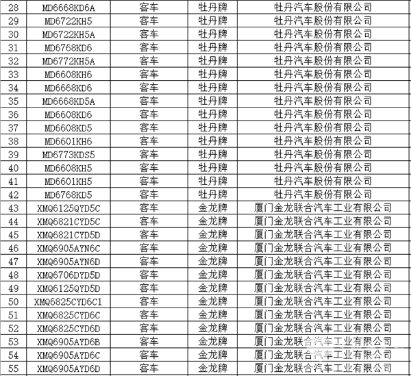 据统计,本次入选的139款客车产品分别来自宇通客车、金龙客车、金旅客车、苏州金龙、安凯客车、中通客车、中车电动、福田欧辉、亚星客车、申龙客车、牡丹汽车、一汽丰田、东风客车(包括东风汽车股份有限公司和东风特种汽车有限公司)、吉利远程、银隆新能源、北方客车、九龙汽车、上汽大通和中国重汽20家车企。