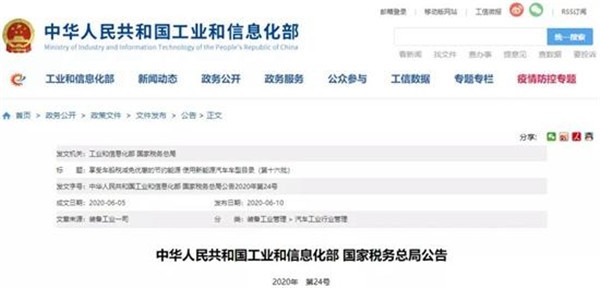 2020年6月10日,工业和信息化部、国家税务总局发布《享受车船税减免优惠的节约能源 使用新能源汽车车型目录》(第十六批)。