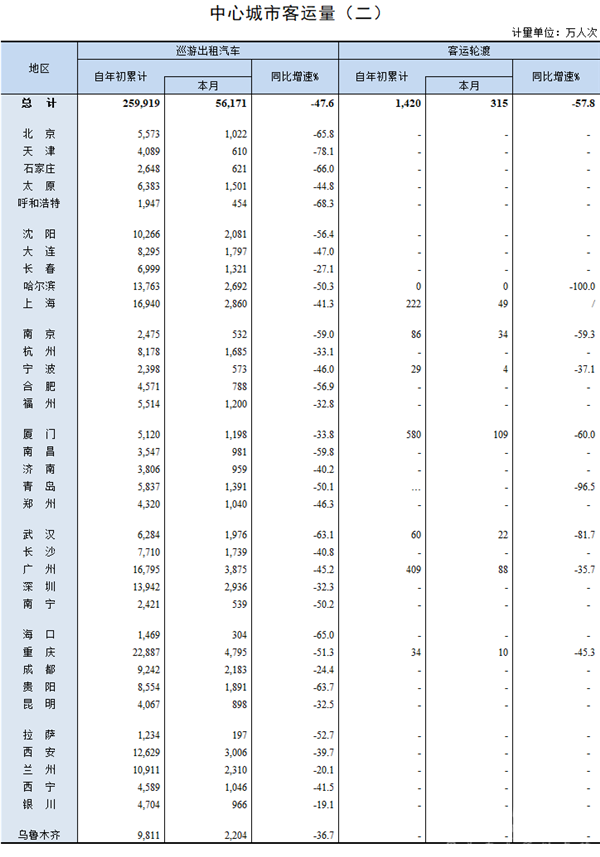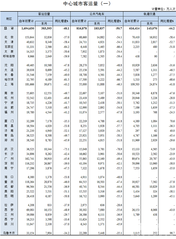 2020年7月20日,交通运输部官网公布了2020年6月中心城市客运量统计数据。数据显示,今年前6月中心城市客运总量在缓慢恢复中。