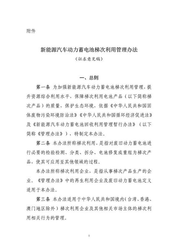 附件:新能源汽车动力蓄电池梯次利用管理办法(征求意见稿)