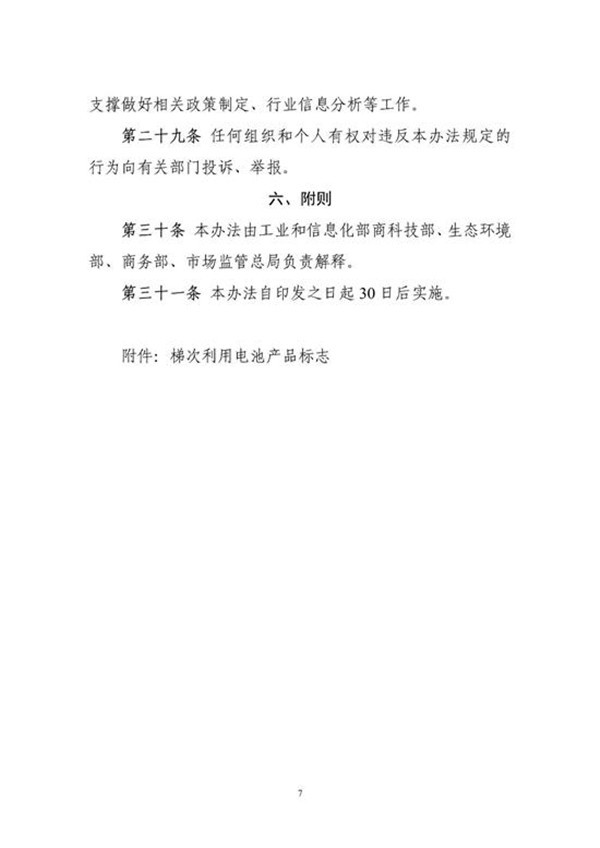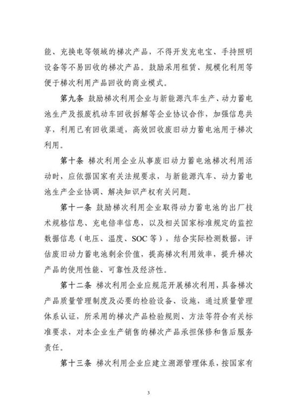 为加强新能源汽车动力蓄电池梯次利用管理,提升资源综合利用水平,保障梯次利用电池产品的质量,我们组织编制了《新能源汽车动力蓄电池梯次利用管理办法》。现将征求意见稿向社会公开征求意见,如有意见或建议,请于2020年11月8日前反馈工业和信息化部节能与综合利用司。
