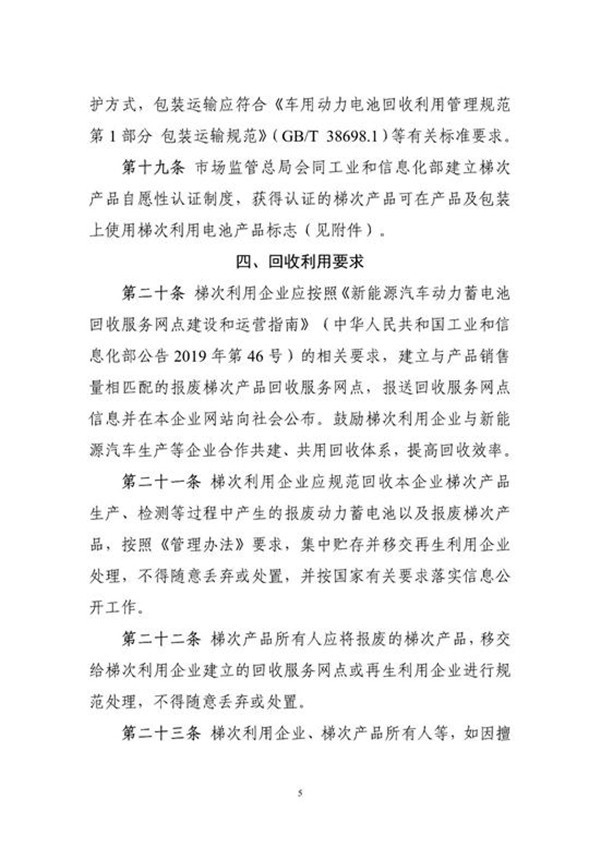 此外,鼓励梯次利用企业与新能源汽车生产、动力蓄电池生产及报废机动车回收拆解等企业协议合作,加强信息共享,利用已有回收渠道,高效回收废旧动力蓄电池用于梯次利用。