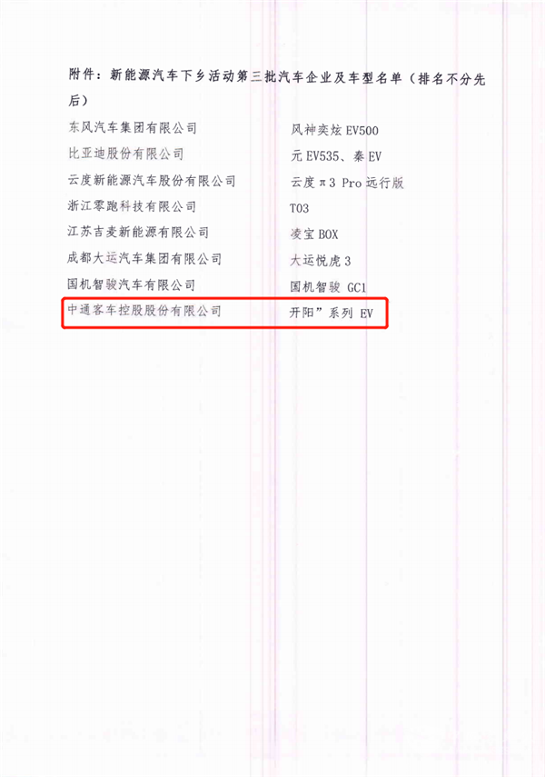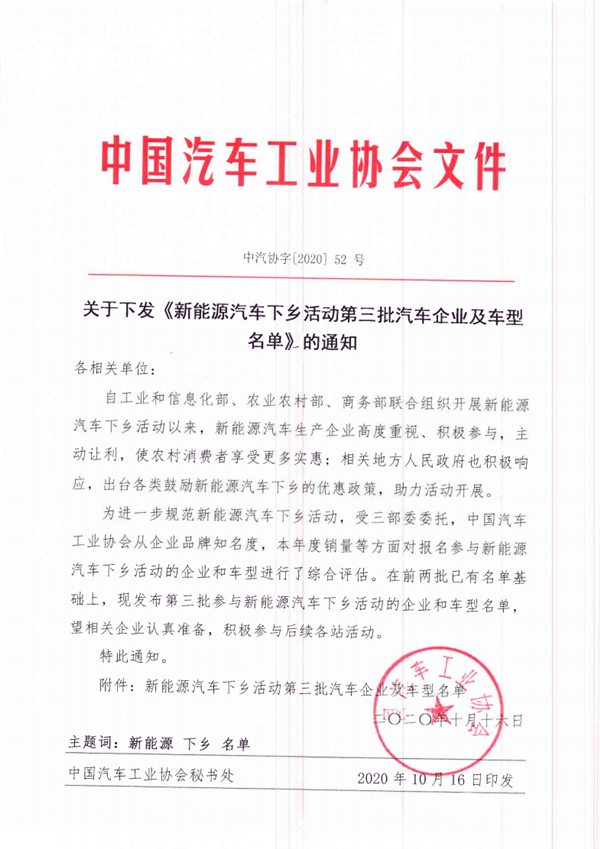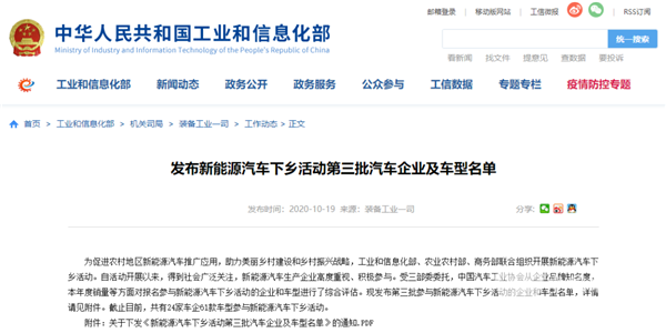 2020年10月19日,工业和信息化部装备工业一司发布了《新能源汽车下乡活动第三批汽车企业及车型名单》。