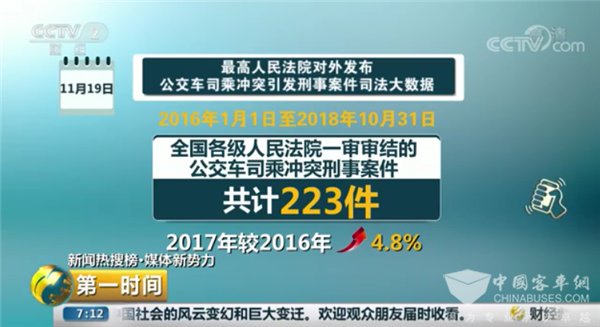 2018年,最高人民法院发布数据显示,2016年1月1日至2018年10月31日全国各级人民法院一审审结的公交车司乘冲突刑事案件共计223件。