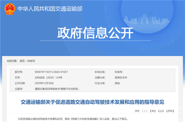 据完美作业网有免费视频了解到,2020年12月30日下午,交通运输部公开发布了《关于促进道路交通自动驾驶技术发展和应用的指导意见》(简称《指导意见》)。