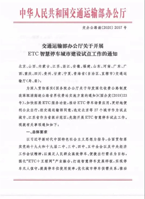 近日,交通运输部办公厅关于开展ETC智慧停车城市建设试点工作的通知,为加快拓展ETC服务功能,推动ETC停车场景应用,更好地便利公众出行,选定北京等27个城市作为试点城市、江苏省作为省级示范区,先期开展ETC智慧停车试点工作。