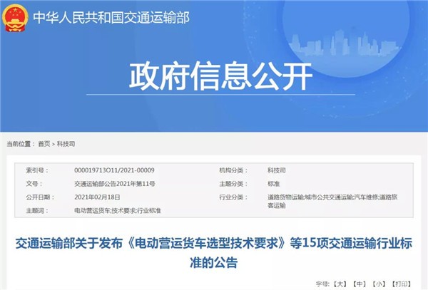 2021年2月18日,交通运输部关于发布《电动营运货车选型技术要求》等15项交通运输行业标准的公告。