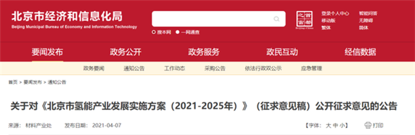 2021年4月7日,北京市经济和信息化局发布公告,对《北京市氢能产业发展实施方案(2021-2025年)》(征求意见稿)公开征求意见,建议征集截至4月15日。