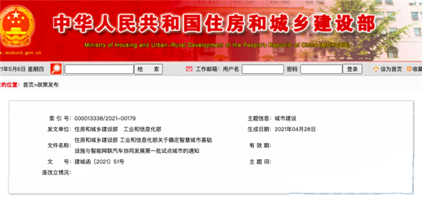 2020年11月底,住建部、工信部联合发布《关于组织开展智慧城市基础设施与智能网联汽车协同发展试点工作的通知》(建办城函〔2020〕594号),以城市为主体自愿申报,试点数量原则上每省(区)1-2个,试点周期为2年。