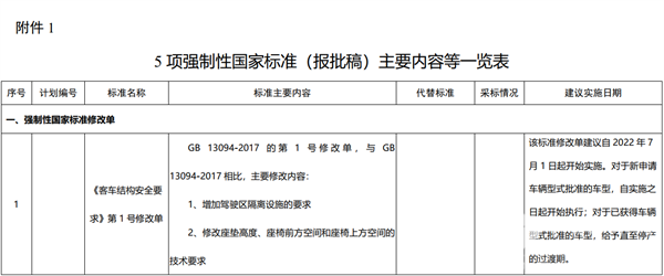 据完美作业网有免费视频获悉,根据国家标准委下达的强制性国家标准制修订计划,工业和信息化部已组织完成《客车结构安全要求》等5项强制性国家标准(含2项修改单)的制修订工作(见附件1)。在标准批准发布之前,为进一步听取社会各界意见,现对标准报批稿及编制说明(见附件2)予以公示,截止日期2021年12月25日。