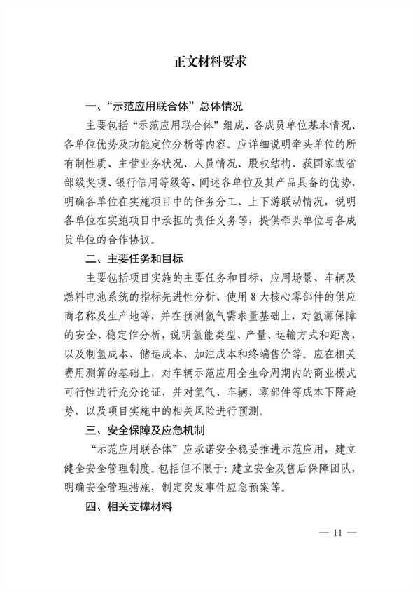 各任务均由“示范应用联合体”申报,由燃料电池系统企业牵头,会同整车制造企业、车辆营运企业、加氢站运营企业、车辆使用单位等组成。牵头单位须与各成员单位签订合作协议书,明确联合体组织方式、项目管理机制、各成员单位权责、具体任务分工等。