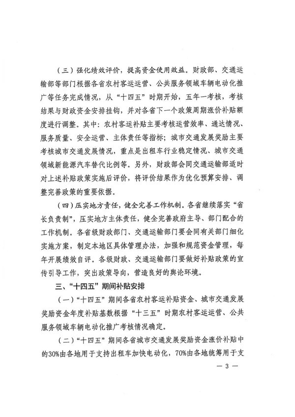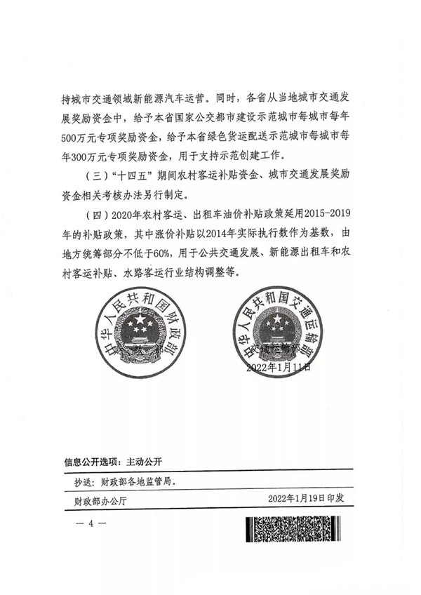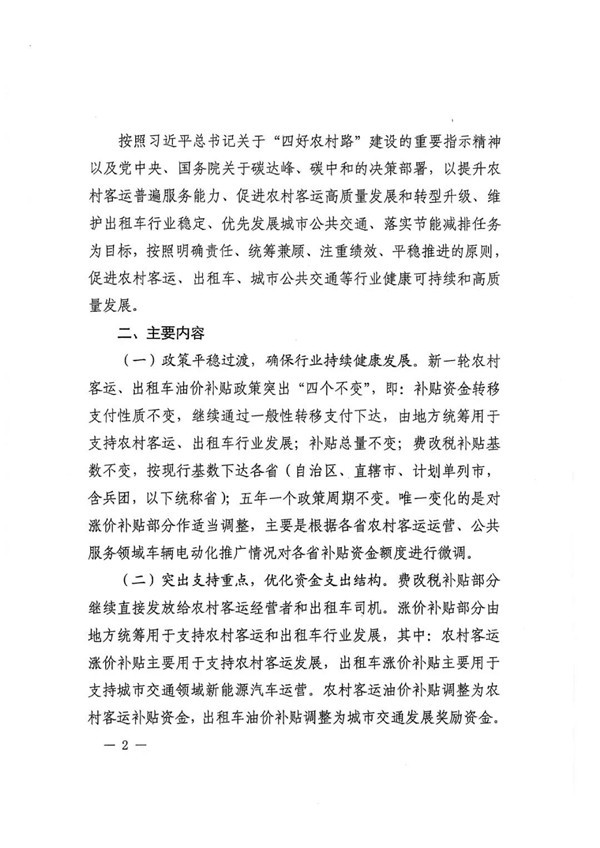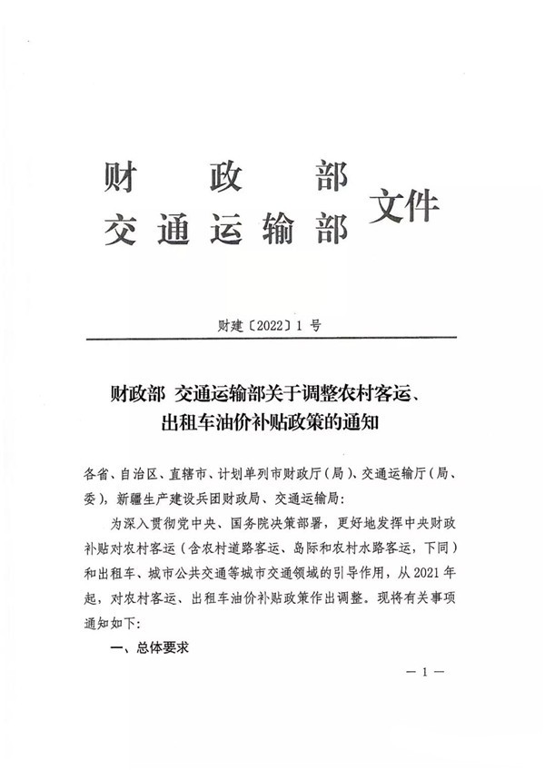 2022年1月19日,财政部、交通运输部联合印发《财政部 交通运输部关于调整农村客运、出租车油价补贴政策的通知》(财建[2022]1号),对“十四五”期政策进行了明确。其中主要内容涉及四大方面,一、政策平稳过渡,确保行业持续健康发展。二、突出支持重点,优化资金支出机构。三、强化绩效评价,提高资金使用效益。四、压实地方责任,健全完善工作机制。