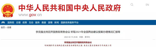 据了解,国务院总理李克强于2022年2月14日主持召开国务院常务会议,听取2021年全国两会建议提案办理情况汇报,要求汇聚众智做好今年政府工作;确定促进工业经济平稳增长和服务业特殊困难行业纾困发展的措施。