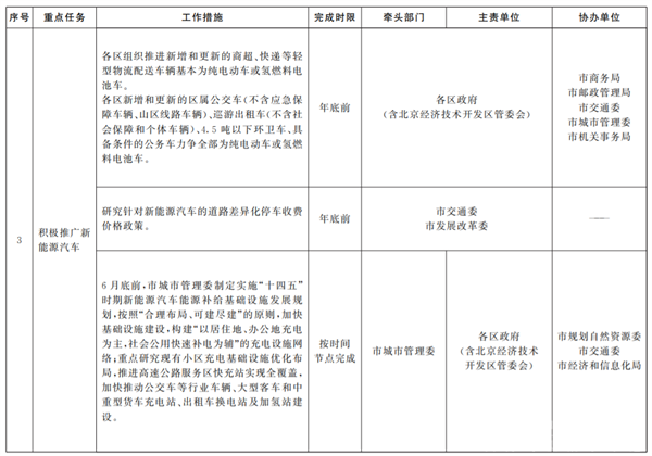 2022年3月2日,北京市印发《深入打好污染防治攻坚战2022年行动计划》,其中提出,积极推广新能源汽车。6月底前,市新能源汽车联席会议办公室牵头,对标“十四五”末全市力争累计推广新能源汽车200万辆的任务要求,制定本市“十四五”时期新能源汽车推广应用工作方案,明确目标措施。按照“时间近半、任务近半”的原则,确定2022年年度目标,并组织实施。按照早实施、早见效的原则,年底前组织相关部门力争实现配套措施、鼓励政策应出尽出。