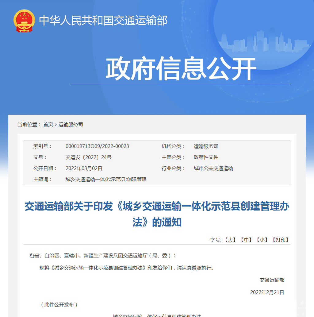 交通部印发《城乡交通运输一体化示范县创建管理办法》的通知