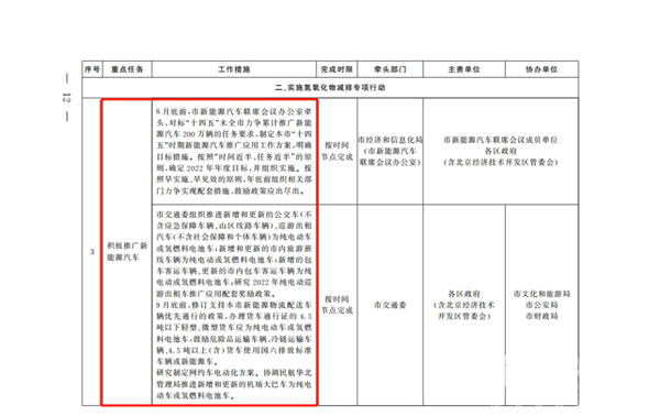 2022年6月底前,由北京市新能源汽车联席会议办公室牵头,对标“十四五”末全市力争累计推广新能源汽车200万辆的任务要求,制定本市“十四五”时期新能源汽车推广应用工作方案,明确目标措施。加大产业科技支撑力度,开展碳中和路径研究、碳排放管理政策制度及管理支撑技术研究等,支持开展有关氢能及可再生能源利用等低碳技术开发研究。