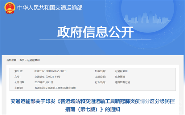 近期我国本土聚集性疫情呈现点多、面广、频发的特点,疫情防控形势严峻复杂,疫情防控难度加大。为深入贯彻落实习近平总书记重要指示精神,认真落实国务院应对新型冠状病毒感染肺炎疫情联防联控机制有关部署要求,进一步加强交通运输疫情防控,部修订形成了《客运场站和交通运输工具新冠肺炎疫情分区分级防控指南(第七版)》(以下简称《指南》)。