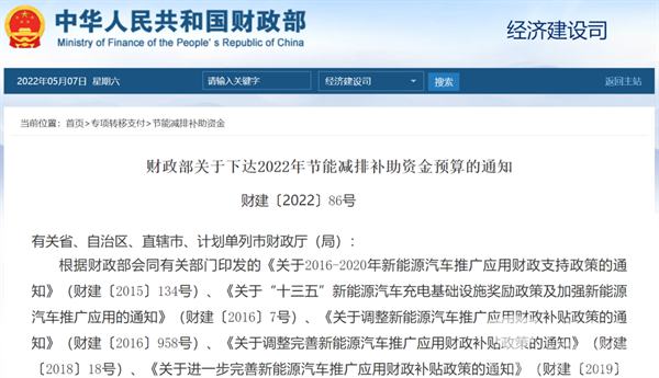 根据财政部会同有关部门印发的《关于2016-2020年新能源汽车推广应用财政支持政策的通知》(财建〔2015〕134号)、《关于“十三五”新能源汽车充电基础设施奖励政策及加强新能源汽车推广应用的通知》(财建〔2016〕7号)、《关于调整新能源汽车推广应用财政补贴政策的通知》(财建〔2016〕958号)、《关于调整完善新能源汽车推广应用财政补贴政策的通知》(财建〔2018〕18号)、《关于进一步完善新能源汽车推广应用财政补贴政策的通知》(财建〔2019〕138号)、《关于完善新能源汽车推广应用财政补贴政策的通知》(财建〔2020〕86号)、《关于2022年新能源汽车推广应用财政补贴政策的通知》(财建〔2021〕466号)等文件规定,现下达你省(区、市)2022年节能减排补助资金(详见附件),用于2019-2020年度新能源汽车推广应用补助资金清算、2019-2021年度新能源汽车推广应用补助资金预拨和2016-2019年度充电基础设施奖励。