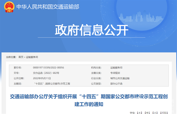 为深入实施城市公共交通优先发展战略,推动城市公共交通高质量发展,有力支撑加快建设交通强国和实现碳达峰碳中和目标,根据《“十四五”现代综合交通运输体系发展规划》和《国家公交都市建设示范工程管理办法》(以下简称《管理办法》)等,交通运输部决定组织开展“十四五”期国家公交都市建设示范工程创建工作。
