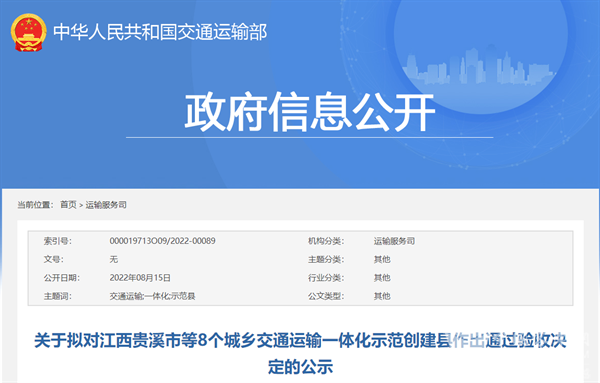 关于拟对江西贵溪市等8个城乡交通运输一体化示范创建县作出通过验收决定的公示