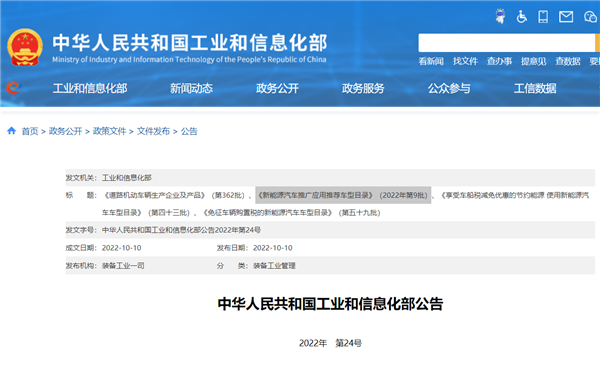 2022年10月10日,工业和信息化部发布了《道路机动车辆生产企业及产品》(第362批)、《新能源汽车推广应用推荐车型目录》(2022年第9批)、《享受车船税减免优惠的节约能源 使用新能源汽车车型目录》(第四十三批)、《免征车辆购置税的新能源汽车车型目录》(第五十九批)四项目录。