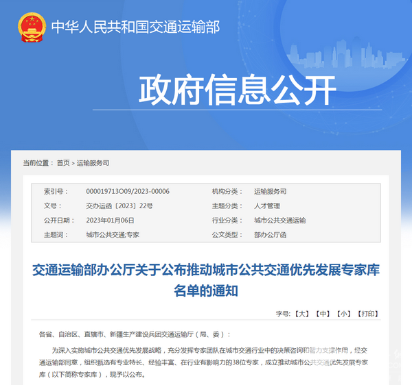 交通运输部:关于公布推动城市公共交通优先发展专家库名单的通知