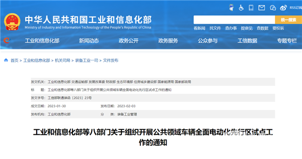 为贯彻落实党中央、国务院“碳达峰、碳中和”战略部署,推进《新能源汽车产业发展规划(2021—2035年)》深入实施,推动提升公共领域车辆电动化水平,加快建设绿色低碳交通运输体系,工业和信息化部、交通运输部会同发展改革委、财政部、生态环境部、住房城乡建设部、能源局、邮政局在全国范围内启动公共领域车辆全面电动化先行区试点工作[本文所指公共领域车辆包括公务用车、城市公交、出租(包括巡游出租和网络预约出租汽车)、环卫、邮政快递、城市物流配送、机场等领域用车],试点期为2023—2025年。有关事项通知如下: