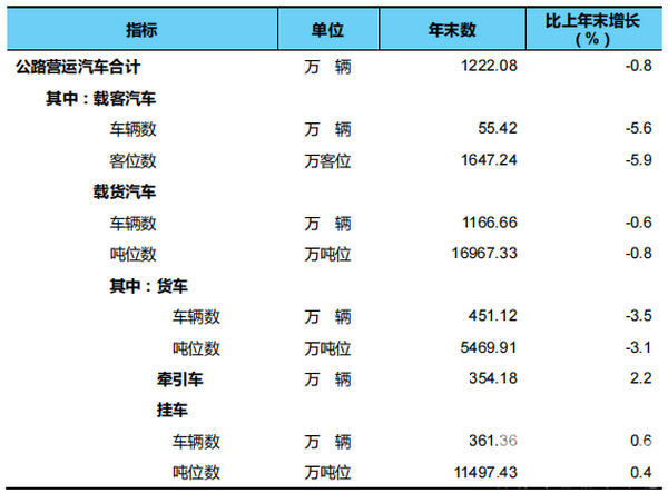 年末全国拥有公路营运汽车1222.08万辆。分结构看,拥有载客汽车55.42万辆、1647.24万客位,比上年末分别减少3.28万辆、103.79万客位;拥有载货汽车1166.66万辆、16967.33万吨位,分别减少6.60万辆、132.17万吨位,其中,普通货车387.69万辆、4716.19万吨位,分别减少19.25万辆、207.24万吨位,专用货车63.43万辆、753.72万吨位,分别增加3.05万辆、34.96万吨位,牵引车354.18万辆、增加7.50万辆,挂车361.36万辆、增加2.11万辆。